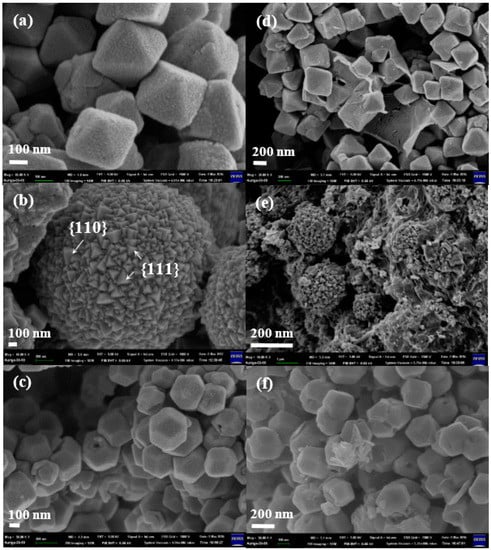 Scanning electron microscope (SEM) images of (a) o-Cu2O; (b) h-Cu2O; (c) r-Cu2O; (d) o-Cu2O-G; (e) h-Cu2O-G and (f) r-Cu2O-G.