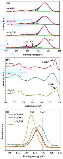 The surface atomic compositions and interfacial electronic states of the samples can be investigated by XPS analysis, as displayed in Figure 4. The peaks at 284.6, 286.5 and 288.4 eV in the C1s spectra (Figure 4a) are assigned to non-oxygenated, epoxy/hydroxyl and carboxyl carbons, respectively [45,46]. The intensities observed for the peaks at 286.5 and 288.4 eV in the o-Cu2O-G, h-Cu2O-G and r-Cu2O-G samples are decreased slightly in comparison to the pure graphene oxide sheets, suggesting that the graphene sheets may maintain the reduced states even with the existence of Cu2O nanocrystals in the samples. The XPS of spectra of Cu2p (Figure 4b) indicate the photocatalysts have the principal and satellite features at ca. 934 eV and 944 eV which are attributed to Cu(II), while the features at ca. 932 and 952 eV are assigned to Cu(I) 2p3/2 and Cu(I) 2p1/2 peaks [9], respectively. In addition, the O1s (see Figure 4c) peaks at ca. 532.5 and 530.3 eV are assigned to C-O and Cu-O bindings, respectively. As a result, the contents of copper(I) for o-Cu2O-G and r-Cu2O-G composites are much higher, indicating that Cu2O nanoparticles may exist stably when dispersed on graphene nanosheets, which can maintain the photocatalytic performance during photodegradation process [47]. Moreover, it is hard to attain bulk information of the atoms by using XPS because a small number of atomic layers on the surface are identified. In addition, it is noteworthy that the diffraction features of copper oxide could hardly be found for all photocatalysts by using the XRD, which is possibly because of the identification of the crystal structure in the bulk phase (see Figure 1).