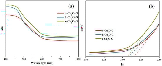 To understand the optical properties of o-Cu2O-G, h-Cu2O-G and r-Cu2O-G nanocomposites, diffused reflectance UV-Vis (DR UV-Vis) absorption spectroscopies were carried out. Figure 5a shows that o-Cu2O-G possesses a band edge of ca. 580 nm in the visible region, suggesting that o-Cu2O-G photocatalysts having the bandgap of ca. 2.2 eV (see Figure 5b) should be a visible light-sensitive semiconductor. However, the r-Cu2O-G photocatalysts show slightly increased absorbance intensities in the visible-light region (400–800 nm) and absorption edge positions as compared to o-Cu2O-G and h-Cu2O-G. Moreover, the band gap of these photocatalysts can be obtained by plotting transformed Kubelka–Munk functions, as illustrated in Figure 5b. The band gaps of o-Cu2O-G, h-Cu2O-G and r-Cu2O-G photocatalysts are ca. 2.20, 2.12 and 2.06 eV, respectively. This finding may be due to their different crystal sizes and distinct exposed facets in the photocatalysts. Combining the outcomes of the XRD, TEM, SEM, XPS and DR UV-Vis spectra, various morphologies of crystal Cu2O incorporated with graphene nanosheets may be able to take advantage of natural light for decontamination and also be recycled for reuse after photocatalytic reactions.