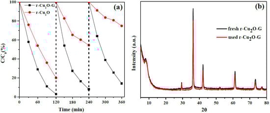 (a) Cyclic tests of r-Cu2O and r-Cu2O-G photocatalysts for MO photodegradation under visible light; (b) XRD patterns of the fresh and used r-Cu2O-G.