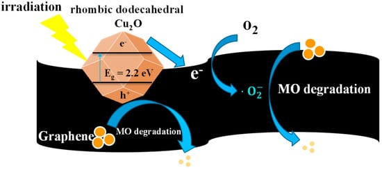 As shown in Figure 8, according to the aforementioned results a probable mechanism for MO degradation by crystal Cu2O-graphene photocatalysts can be proposed. Upon visible-light illumination, the crystal Cu2O (e.g., rhombic dodecahedra Cu2O) is excited to produce electrons (in the conduction band (CB)) and holes (in the valence band (VB)). Because of the stronger contact between crystal facets and the graphene surface, the photogenerated electrons can be rapidly transported to the graphene nanosheets. As a consequence of the small difference between the Fermi potential of graphene and the reduction potential of O2/O2− [50], O2− and H2O2 can be observed after the reaction of high-energy electrons with the dissolved oxygen. In this way, the recombination of electron/hole pairs can be greatly prohibited. In addition, compared to octahedral Cu2O (mainly {111} facets), the holes (h+) with positive charge generated on the valence band (ca. 1.92 eV vs. normal hydrogen electrode (NHE)) of rhombic dodecahedra Cu2O (mainly {110} facets) also can degrade more MO molecules (ca. 1.48 eV vs. NHE) [51,52] since the number of dangling Cu atoms on the {110} plane per unit surface area was nearly 1.5 times higher than that on the {111} plane, resulting in a more positively charged surface on {110} facets [28]. Therefore, the superoxide radical anions, hydrogen peroxide and h+ may be the dominant species governing the photodegradation of MO under visible-light irradiation. It should be noted that the graphene sheets not only serve as acceptors of the photogenerated electrons from Cu2O but also as stabilizers to prevent the crystal Cu2O from structural destruction under irradiation over a long period.