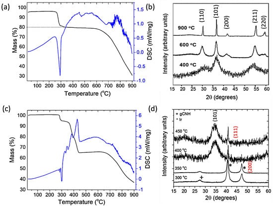 (a) TGA/DSC of the reaction between (NH4)Ir2Cl6 and NaNO3 conducted in air at a 5 °C min−1 heating rate; (b) the XRD of the IrO2 NPs produced at 400, 600, and 900 °C by the Adams’ fusion method; (c) the TGA/DSC of (NH4)Ir2Cl6, NaNO3, and gCNH support conducted in air at a 5 °C min−1 heating rate; (d) XRD of the gCNH-IrO2 prepared at 300, 350, 400, and 450 °C. Note: the NaCl formed in the reaction was washed out prior to the XRD acquisition. The weak feature for gCNH occurs at ~27° 2θ. The characteristic strong (111) and (200) reflections for metallic Ir are indexed in red.