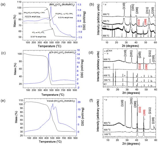 A further series of TGA/DSC/XRD experiments were performed to compare the effects of adding gCNH or commercial carbon (Vulcan, Texas, TX, USA) catalyst supports dispersed in isopropanol, again without adding NaNO3 to the reaction mixture. In the case of the gCNH-(NH4)2IrCl6 combination, we observed a mass loss of ~80% with onset at 450 °C (Figure 3c), that is, 50% greater than in the absence of the catalyst support medium. We also obtained XRD patterns for the reaction products at different temperatures: 300, 400, 500, and 900 °C (Figure 3d). The gCNH signal had disappeared by 500 °C, at the temperature by which the Ir metal appears in the XRD pattern before there is any indication of IrO2 formation. At 900 °C, the appearance of IrO2 could be detected by XRD, while some Ir metal also remained present. This behavior is completely different from the sample studied without the presence of gCNH, indicating that the carbon nitride material is an essential participant in the redox reactions. For the Vulcan-(NH4)2IrCl6 system, the TGA/DSC also showed a higher weight loss than in the case of the (NH4)2IrCl6 alone. However, no abrupt loss of weight was observed at 500 °C, but instead, a gradual decrease in mass with increasing temperature was observed (Figure 3e). XRD analysis showed that the Ir metal was formed at 500 °C, but IrO2 was also detected, and this became the main product at 900 °C (Figure 3f).