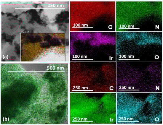 TEM images and corresponding energy-dispersive X-ray spectroscopy (EDX) mapping for (a) gCNH-IrO2 (40%) prepared by the ball-milling of pre-prepared IrO2 and gCNH materials; (b) gCNH-IrO2 (20%) prepared by in situ deposition of IrO2 on gCNH support following an adaptation of Adams’ fusion method at 450 °C.