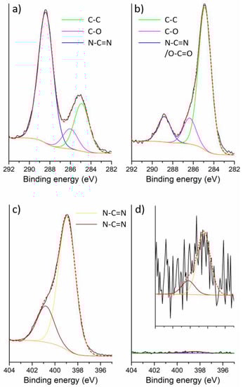 The C 1s spectra (Figure 6a,b) for both samples contain the same number of peaks, which can be fit with Gaussian-Lorentzian (GL) contributions at equivalent binding energies. The peak near 288 eV in the ball milled sample is typically assigned to sp2 bonded C atoms associated with triazine or heptazine ring units in the carbon nitride (N-C=N) [44]. The other two peaks at the C-C peak at ~284 eV and ~286 eV can be attributed to C-C and C-O bonding environments, either associated with adventitious carbon species or due to the C-C bonding intrinsic to the structure [44]. The magnitude of these peaks is dramatically different between the two samples. In the ball-milled material, the N-C=N carbon peak is dominant and contributes 65 at %, with the C-C peak contributing 24 at %. In the Adams’ fusion material made at 450 °C the carbon peak at 288 eV only accounts for 13 at %, significantly less than the same peak in the ball milled material. The C-C bonded sites represent 73 at % of the sample. In both cases, the C-O peak contributes the remaining ~10 at %.