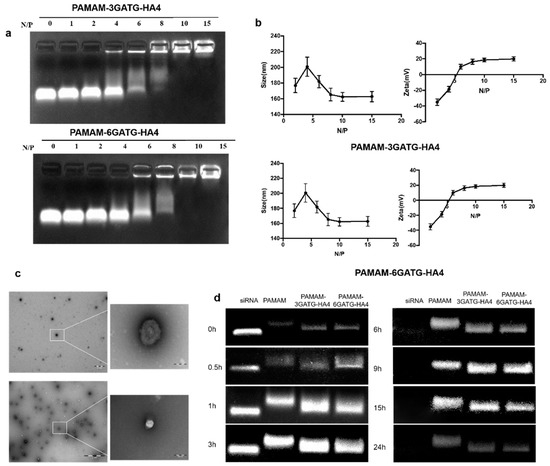 One of the most critical problems that exists during gene delivery is degradation by RNase. To address this, the vector is required to completely encapsulate the siRNA, reducing degradation by RNase during delivery [35]. The potential for stable siRNA loading was studied using an electrophoretic gel retardation assay at different N/P ratios (Figure 2a). When the N/P ratio was higher than six, the nanocomplexes demonstrated good binding ability through electrostatic interaction. Complete complexation and blocking of siRNA were observed when the N/P ratio was higher than 10 for both PAMAM-6GATG-HA4/siRNA and PAMAM-3GATG-HA4/siRNA nanocomplexes. The results showed that the modified dendrimers possessed sufficient cationic charge and could efficiently bind the negatively charged siRNA. Furthermore, the N/P ratio of the cationic material to the siRNA used in this study was 10:1.