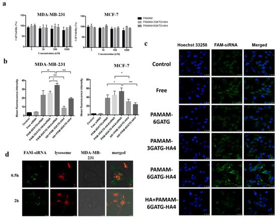 A confocal fluorescent microscope was used to compare the intracellular distribution of the nanocomplexes of the dendrimers and siRNA. MDA-MB-231 cells were seeded on glass-bottom dishes (2 × 105) containing complete DMEM and incubated for 24 h. Following three washes with PBS-containing heparin (125 U/mL), the nanocomplexes were treated in serum-free medium for 4 h at 37 °C. The final concentrations of FAM-siRNA in the culture medium were 200 nM. Subsequently, the cells were rinsed three times with cold PBS containing heparin (125 U/mL) and fixed with 4% formaldehyde for 15 min. After another three rinses with cold PBS, the cell nuclei were stained with Hoechst 33258 (5 mg/mL) for an additional 20 min at 37 °C. Then, the cells were imaged using a confocal laser scanning microscope (CLSM, Leica, Heidelberg, Germany). FAM-siRNA and Hoechst were excited using 488 nm and 345 nm lasers, respectively. To track the internalization and endosomal release of FAM-siRNA, MDA-MB-231 cells were incubated for 0.5 or 2 h with dendrimer/FAM-siRNA. Then, endosome/lysosome labeling was performed with LysoTracker Red (250 nM) for 30 min. After nuclear staining, the cells were observed by a CLSM. The LysoTracker Red and Fluorescein isothiocyanate (FITC) were excited by 561 nm and 488 nm lasers, respectively [33].
