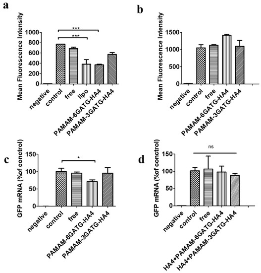 The gene silencing efficacy of PAMAM-GATG-HA4/siRNA nanocomplexes was evaluated on flow-cytometry with a treatment of 200 nM siRNA for 48 h. PAMAM-6GATG-HA4/siRNA showed significant gene silencing efficacy compared with free siRNA (p < 0.01) and PAMAM-3GATG-HA4/siRNA nanocomplexes in our GFP silencing study (Figure 4). No significant difference was found between lipofectamine 2000, a commercially available transfecting agent, and PAMAM-6GATG-HA4/siRNA nanocomplexes (p > 0.05). However, the commercially available lipid-based transfection agent is highly cationic and its high transfection efficiency is based on non-specific interactions with cells, limiting their utility in the treatment of tumors. Gene silencing results also indicated that the modified dendrimers have tremendous potential to help siRNA in terms of its gene silencing effect [30].