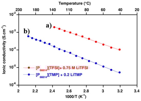 The amount of lithium salt corresponding to the maximum soluble in ionic liquid was determined to 0.75 M for LiTFSI in [P66614][TFSI] and 0.2 M for LiTMP in [P66614][TMP]. The ionic conductivity of phosphonium electrolytes measured by Electrochemical Impedance Spectroscopy (EIS) and calculated by Equation (1) is reported in Figure 1.