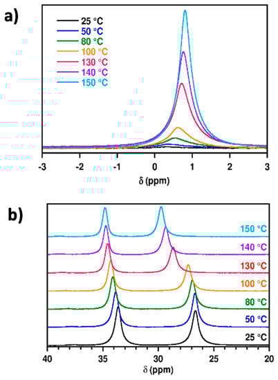 To understand the absence of lithium signal, 7Li and 31P NMR spectroscopy were carried out under high-resolution liquid-state NMR conditions, in a temperature range from 25 °C up to 150 °C. The recorded spectra are shown in Figure 2.