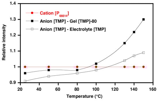 Evolution of the normalized relative intensity of the phosphinate anion compared to the relative intensity of the cation as a function of the temperature for the electrolyte [TMP] ([P66614][TMP] + 0.2 M LiTMP).