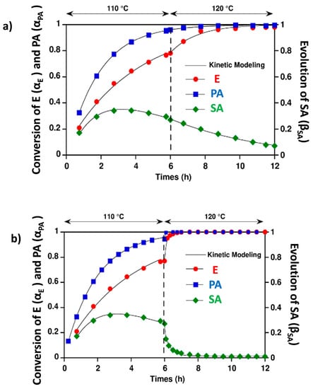 where x is the conversion, k is the kinetic constant of the reaction, x∞ is the conversion at an infinite time (usually equal to 1), x0 is the conversion at t = 0 or t = 6 h. The kinetic constants from the modelling are shown in Table 6.