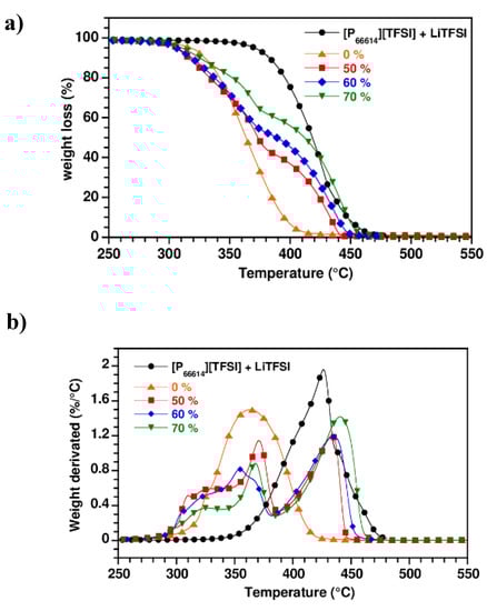 Thermo-gravimetric analyses (TGA) (a) and dynamical mechanical analysis (DTG) (b) of electrolyte ([P66614][TFSI] + 0.75 M LiTFSI) alone and introduced in PPO-Jeffamine networks prepared with an electrolyte varying content (heating ramp: 10 K·min−1; atmosphere: Nitrogen).