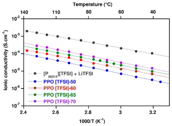 To confirm the potential use of this system as a gelled electrolyte for lithium-ion battery, a film with low thickness (<100 µm) was prepared by solvent casting. The gelled electrolytes were prepared with different amounts of electrolyte containing [P66614][TFSI]/lithium salt (LiTFSI). The ionic conductivities were measured by Electrochemical Impedance Spectroscopy (EIS) and calculated by Equation (1).