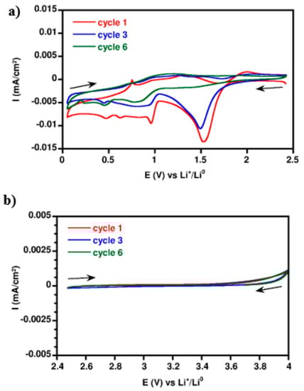 In the reduction (Figure 7a), the electrochemical phenomenon at 1.5 V and 1 V are observed with a current intensity measured at −0.014 mA·cm−2 and at 0.01 mA·cm−2, respectively, for the first cycle. This phenomenon, observed as well for the electrolyte [TFSI], was attributed to the formation of a passivation layer that stabilizes at the 6th cycle. As the electrolyte is based on ionic liquids, the SEI should be different, as in conventional carbonate based electrolytes. The nature of the passivation layer is attributed to the chemical nature of the IL. In oxidation (Figure 7b), the current measured is very low (<2 µA·cm−2). Thus, it is possible to consider the gelled electrolyte is electrochemically stable with stainless steel to 4 V vs. Li+/Li0.