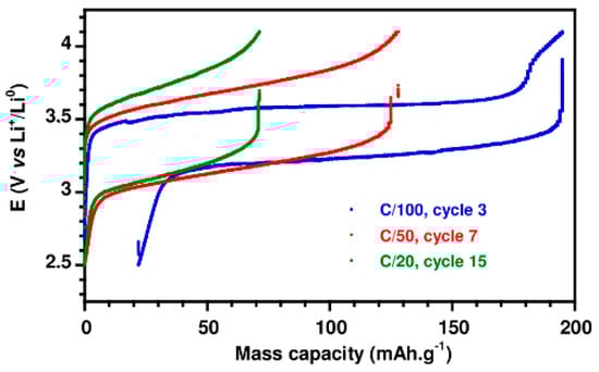 The gelled electrolyte was tested in the Li|LiFePO4 cell at different current densities (C/100, C/50, and C/20) between 2.5 V and 4 V at 100 °C. The results are presented for the cycle 3, 7 and 15 in Figure 8.