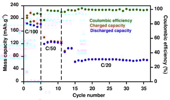 The Li|PPO [TFSI]−70|LiFePO4 shows a good cycling performance, with large charge/discharge capacities ranging from 210 m Ah·g−1 (slightly upper of the theoretical capacity) at C/100 and the initial coulombic efficiency is ~90% (Figure 9). The additional current consumption in charge was attributed to the degradation of the gelled electrolyte. When the current rate was increased to C/50, and then to C/20, the charge and discharge capacity was approximately the same with a better coulombic efficiency. However, the specific capacity was decreased to around 120 m Ah·g−1 then to 70 m Ah·g−1, which corresponds to 40% of the theoretical capacity. This decrease could be correlated to the lower ionic conductivity of the gelled electrolyte, which could induce an additional ohmic resistance and concentration gradients within the electrolyte. Therefore, the charge transfer could be more difficult to the electrodes and the polarization of the cell would be increased. Nevertheless, a good cycle stability was observed at C/20 over 20 cycles with a capacity of around 70 m Ah·g−1.