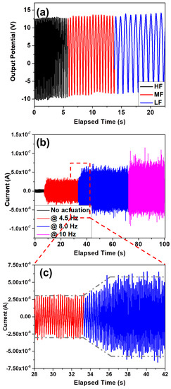Piezoelectric output as a function of actuation frequency (a) open circuit voltages, high frequency (HF), medium frequency (MF), and low frequency (LF); (b) short circuit current; and, (c) the trend of output current by increasing the frequency of actuation source.