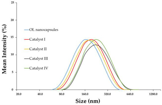 Representative particle diameter distributions of OL nanocapsules and Catalyst I–IV.