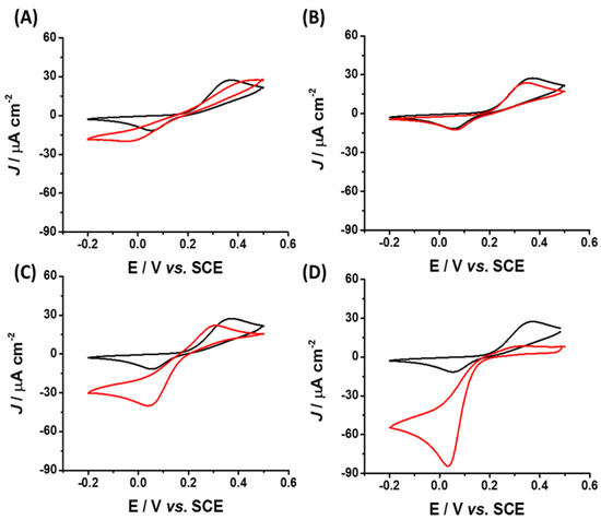 Cyclic voltammograms of OL nanocapsules (black line, A–D), Catalyst I (red line, (A)), Catalyst II (red line, (B)), Catalyst III (red line, (C)), and Catalyst IV (red line, (D)) performed in 250 µM catechol solution (50 mM PBS buffer pH 6.5 + 100 mM KCl) at a scan rate of 5 mV s−1.