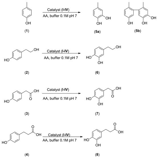 Catechols are characterized by several biological activities and are well recognized as antioxidant compounds [67]. The biotechnological potential of tyrosinase in the synthesis of catechols has received a great degree of attention because they are difficult to obtain under environmentally friendly conditions by means of traditional chemical procedures [68]. Briefly, phenols 1–4, catalysts I–IV (540 units), and ascorbic acid AA (2.0 equiv) were stirred in PBS (0.1 M, pH 7.0, 5.0 mL) at room temperature, under a dioxygen atmosphere (O2). Ascorbic acid was used as an internal reducing agent to avoid the polymerization of the quinone intermediates [69]. As a general trend, catalysts I–IV were able to oxidize phenols to corresponding catechols from a moderate to high yield. No oxidation was observed in the presence of OL alone. Irrespective of the experimental conditions, catalysts III and IV were more reactive than catalyst II, affording the desired catechols in acceptable yields.