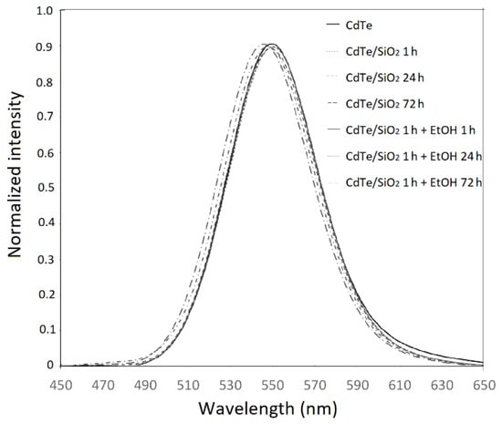 The emission spectrum of as-synthesized CdTe QDs is shown in Figure 1. The spectra of the CdTe/SiO2 QDs correspond to the particles taken out of the reaction vessel during the growth phase with and without ethanol at 1, 24, and 72 h. The spectra show that, during the growth of silica shell, only small changes of maxima wavelength and intensity appeared. Thus, the fluorescence wavelength of our CdTe/SiO2 QDs is nearly independent of the silanization time. This is a confirmation of the fact that silica coatings do not affect the luminescence of QDs particles, and the process of coating does not affect a size of CdTe core. A similar behavior was observed by Jing et al. [13]. In contrast, Wolcott et al. [15] found a shift of a maximum of between 555 nm (unmodified CdTe QDs) to 580 nm after the silica shell was formed. This fact was explained as a result of passivation of the surface by an exchange of ligands from TGA (thioglycolic acid) to MPS, and by the decrease in charged species on the surface [15].