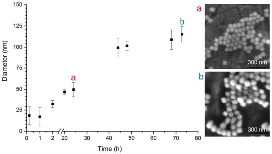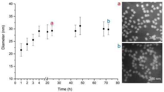 In our study, we monitored an increase of particle diameter with the time of silica shell growth. The results of DLS measurements are demonstrated in Figure 3 and summarized in Table 1. As shown here, without any ethanol precipitation, the diameter size of 23 nm grows up to 30 nm in 4 h, and does not change substantially after 72 h (DLS data). The obtained DLS characteristics were complemented by SEM micrographs, as presented in Figure 3 by inset (a) and (b) and in Table 1. A similar size of both NPs was observed after 24 h (53.7 ± 4.2 nm) and 72 h (59.7 ± 4.0 nm) by SEM method as well.