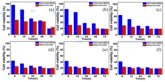 The in vitro drug release behavior of DOX-loaded MOGs on HeLa cells was also investigated. DOX-loaded MOGs and MOGs + free DOX with different concertation were studied. The results are shown in Figure 5a–f. Accordingly, the viability of cells incubated with DOX-loaded MOGs gradually decreased in the time range of 72 h. This was in contrast with the sudden reduction behavior of the viability of cells incubated with MOGs + free DOX, in all the control experiment groups.