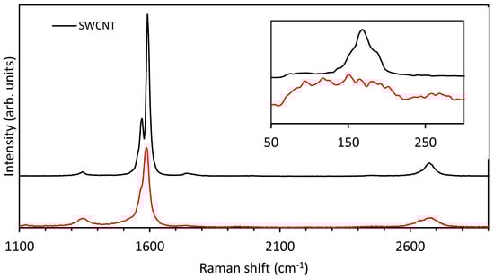 Raman spectroscopy is extremely sensitive to repetitive network structure within CNTs. The sp2 network experiences planar vibrations resulting in Raman features around 1580 cm−1 annotated as G peaks []. Any defects or disorder in the structure will give rise to a D band approximately 1350 cm−1. A ratio of the intensity of the G and D peaks (G:D ratio) can be made to indicate, on average, the type of bonding the carbon atoms have within the repetitive structure and provide a value to quantify the order or disorder for different samples [,]. A radial breathing mode (RBM) band is also observed in Raman spectroscopy when looking at CNTs []. Due to its cylindrical nature, vibrations of the atoms on average will allow for contracted and expanded diameters giving a mechanism to estimate the diameter of the CNTs []. The Raman band just below 2700 cm−1 (~2680 cm−1) is an overtone of the D band and is commonly called the G’ band []. Like the RBM bands, the position of the G’ peak is related to the diameter of the nanotubes and the shape can also give an indication of whether a nanotube sample is single-walled or double-walled. For single-walled nanotubes the G’ band is typically a single symmetric peak, but for double-walled some broadening and asymmetry can potentially be observed. This is due to the inner and outer nanotubes in the double-walled nanotubes having different diameters []. It should also be noted that the nanotube diameter dependence is much weaker for the G’ band than for the RBM band [].
