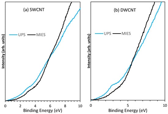 The UP and MIE spectra of SWCNTs (at 113 K) are presented in Figure 2a. Both the UP and the MIE spectra share the peak at 3 eV and a broad structure between 6 and 8 eV; the UPS has a peak evident at 8 eV. The 3 eV corresponds to the 2pπ states whilst the feature at between 6 and 8 eV relates to the 2pσ states [,].