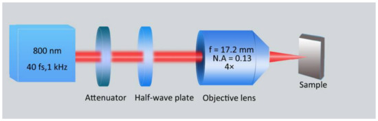 As shown by a schematic illustration of the experimental setup in Figure 1, a commercial chirped-pulse-amplification of a Ti:sapphire laser system (Spitfire Ace, Spectra Physics, Santa Clara, CA, USA) was employed as a light source for producing the surface structures, which delivers horizontally polarized femtosecond laser pulse trains with a repetition rate, a central wavelength, and a time duration of 1 kHz, 800 nm, and 40 fs, respectively. The maximum energy of each laser pulse was 7 mJ. Neutral density filters and a half-wave plate were used to control the pulse energy and the direction of the laser polarization, respectively. The laser beam was focused by an objective lens (plan fluorite objective, 4×, N.A = 0.13, f = 17.2 mm, Nikon, Tokyo, Japan) at normal incidence. The sample was mounted on a three-dimensional translation stage (ESP301, Newport Inc., Irvine, CA, USA) that could be precisely translated via a custom-made computer program. In order to avoid serious ablation of the material, the sample surface was moved 300 µm away from the focus towards the lens, such that the focus is located inside the sample, resulting in a laser spot radius of ≈39 μm on the sample surface.