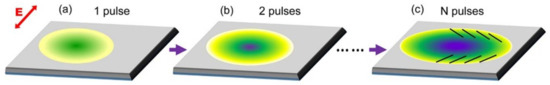 To elucidate our experimental observations, we proposed the following physical scenario: In our experiments, which are in fact based on multi-pulse femtosecond laser irradiation processes, the pristine surface of the metal film was modified by the preceding incident femtosecond laser pulses, leading to a rough, shallow crater with the modulation depth gradually reducing from the beam center to the peripheral regimes, as shown in Figure 4a, where the inclined surface was created on the laser irradiation area. After that, for the continuous irradiation of the subsequent femtosecond laser pulses, the inclining degree of the laser irradiation surface became pronounced (Figure 4b), and the periodic subwavelength ripple structures were also developed on it, exhibiting the slantwise orientation with respect to the direction of the laser polarization, as shown in Figure 4c. Noticeably, due to the higher intensity distribution on the central region of the laser-scanned area, the formation of the corresponding ripple structures was seriously deteriorated by the accumulating irradiation of subsequent femtosecond laser pulses.