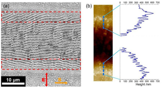 To further characterize the features of such slantwise-oriented ripple structures, we employed AFM to measure their modulation depths, and the corresponding results are shown in Figure 2b. Clearly, the measured oscillation curve reveals that the modulation depth of the ripple structures decreases gradually with increasing the distance from the center to the lateral edges of the laser-scanned area, which is due to the spatially inhomogeneous distribution of the laser pulse intensity. On the other hand, the measured peaks suggest that the modulation height of the surface is also varied as a function of the distance from the center of the laser-scanned area. This can be physically understood as follows: The film thickness decreased after irradiation of multiple femtosecond laser pulses, leading to the film thinning at the center of the laser-scanned area with respect to the lateral edge regions. Consequently, the formation of such slantwise oriented periodic ripple structures is in fact based on the gradient variation of the film thicknesses.