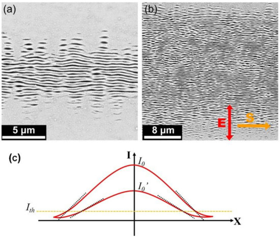 - Huang, M.; Zhao, F.L.; Cheng, Y.; Xu, N.S.; Xu, Z.Z. Origin of laser-induced near-subwavelength ripples: Interference between surface plasmons and incident laser. ACS Nano 2009, 3, 4062–4070. [Google Scholar] [CrossRef] [PubMed]