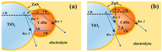 Schematic diagrams of interfacial recombination paths occurring at a photoelectrode. The ZnS coating deposited after the deposition of CdSe quantum dots (QDs) (a); and before and after the deposition of CdSe QDs (b).