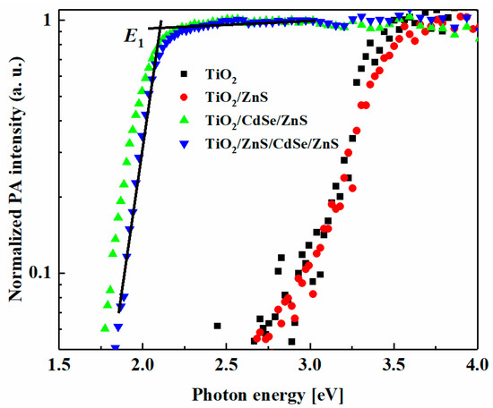 We prepared four different types of samples, i.e., TiO2, TiO2/ZnS, TiO2/CdSe QD/ZnS and TiO2/ZnS/CdSe QD/ZnS samples. The former two were IO-TiO2 electrodes with and without ZnS passivation on the electrodes. The latter two were CdSe QDs adsorbed on these IO-TiO2 electrodes, and finally, ZnS (2 cycles) were adsorbed on the QD surfaces. The optical absorption properties of the prepared electrodes were investigated using the photoacoustic (PA) technique and the PA spectra are shown in Figure 2 and Figure S1. The PA spectra were normalized at the photon energy of 3.7 eV. The PA spectra of TiO2 and TiO2/ZnS were almost the same and no apparent shift was observed. This is because the bandgap energy of ZnS (3.6 eV) was higher than that of TiO2 (3.2 eV). However, red shifts of the PA spectra were observed clearly after CdSe QD adsorption. Moreover, we found that the adsorption of the QD became faster in the case of the TiO2 electrode with ZnS passivation layers. This phenomenon is considered to result from the possible formation of CdS between ZnS and CdSe QDs. Therefore, the samples with and without ZnS passivation adsorbed CdSe QDs for 4 h and 9 h, respectively, to make the QD size the same. The results are displayed in Figure 2. Here, the PA shoulder was assumed to be the first excitation energy level, E1, of the CdSe QDs [9,21,22]. The average diameter of the QDs could be estimated by using the effective mass approximation [23,24], as shown in Equation (1):