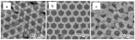Figure 3 and Figure 4 show the typical scanning electron microscopy (SEM) images of the IO-TiO2 without ZnS passivation (a), with 5 cycles of ZnS passivation (b) and with 15 cycles of ZnS passivation (c), without and with CdSe QD adsorption, respectively. As shown in Figure 3, the wall of the IO-TiO2 electrode became thicker after ZnS passivation cycle increased. Figure 4 and Figure S2 show that CdSe QD formation initiated on the TiO2 surface. A highly ordered TiO2 framework with air holes was obtained after 5 cycles of ZnS passivation. However, at 15 cycles of ZnS passivation, the IO structure broke and its porous size became smaller after QD adsorption. The reason of the IO breakdown is the washing of the electrodes during the SILAR process. In this method, dissolved cationic and anionic precursors are put into two beakers, and then the bare electrode is dipped alternatively into each solution for growing the QDs on the electrode. After absorption of Zn2+ or S2− ion, the electrode needs to be washed with methanol. With the number of ZnS deposition cycles increasing, washing time is multiply increasing. Therefore, it is thought that the surfaces of some IO structures were destroyed.