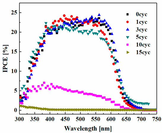 Figure 5 shows the incident photon-to-current conversion efficiency (IPCE) spectra of the CdSe QDSSCs with different ZnS passivation layers. The IPCE peak value was about 24% at 550 nm for the device without ZnS passivation. For enhancing the IPCE values, it is necessary to prepare thicker IO-TiO2 electrodes. As shown in Figure 5, the IPCE value decreased greatly as the ZnS passivation cycle number exceeded 10. This is because of the reduction of electron injection from CdSe QDs to IO-TiO2 for thicker ZnS passivation layers.