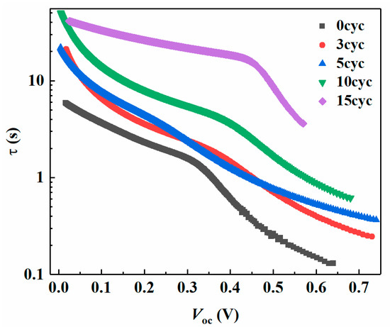 where e is the elementary charge, kB is the Boltzmann constant and T is temperature. Figure 7 shows τ of CdSe QD-sensitized IO-TiO2 solar cells with different ZnS passivation cycles, which was calculated from the Voc decay curves (Figure S4). From Figure 7, we can clearly see that τ of these QDSSCs with ZnS passivation layers was longer than that of device without ZnS passivation layers, especially at the high Voc region. In addition, with the ZnS passivation cycle number increasing, the value of τ became larger at the same voltage. Larger τ reflected that there was less recombination in the devices. It means that both of recombination occurring at the IO-TiO2/electrolyte interface and the IO-TiO2/CdSe QDs interface were suppressed after ZnS coating. Notably, for 10-cycle and 15-cycle samples, although there was less recombination in these two type devices compared with the other four samples, the electron injection from CdSe QDs to IO-TiO2 became difficult due to the thicker ZnS layers, which resulted in low Jsc and efficiency. This result agreed strongly with the photovoltaic performance, as shown in Figure 6 and Table 1.