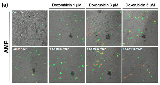 The effects of AMF exposure on cell death were investigated as follows: cells were seeded onto four-compartment Cellview dishes, incubated with Gastrin–MNPs in incubation medium, washed, incubated with doxorubicin and exposed to AMF as previously described. Four hours after AMF exposure, dead cells were labeled with FITC-annexin V (AnnV) and/or propidium iodide (PI) (Cell Meter Annexin V apoptosis assay kit, AAT Bioquest, Sunnyvale, CA, USA) in accordance with the manufacturer’s instructions. The counting of labeled cells was carried out through the analysis of confocal microscopy images (LSM510, Zeiss) representing populations of 2000–3000 cells/experiment using Image J software (National Institutes of Health, Bethesda, MD, USA, https://imagej.nih.gov/ij/, 1997–2016).