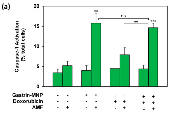 Analysis of Caspase-1 and Caspase-3 activation. INR1G9-CCK2R cells were incubated with Gastrin–MNPs ([Fe] = 16 µg/mL) for 24 h, allowing their internalization and lysosome accumulation and washed to eliminate unbound and non-internalized nanoparticles, before the addition of 3 µM of doxorubicin for another 24 h and exposure or not to AMF (40 mT, 275 kHz). The activation of Caspase-1 (a) and Caspase-3 (b) was analyzed 4 h after AMF exposure by confocal microscopy of cells labeled with FAM-FLICA-Casp1 or FAM-FLICA-Casp3. Results are expressed in % of total cells labeled with fluorescent Caspase substrate and are the mean ± SEM of at least three separate experiments. Significant differences (*) compared to the control condition corresponding to cells devoid of Gastrin–MNPs in absence of AMF exposure and doxorubicin treatment are indicated above histogram bars. Statistical significance (*) between other conditions is also indicated.