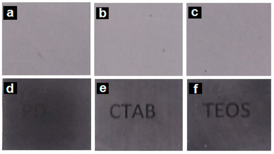 Contact transparency pictures of the electrospun poly(3-hydroxybutyrate) (PHB) fibers containing palladium nanoparticles (PdNPs) and their respective annealed films: (a) PHB/PdNP fibers; (b) PHB/PdNP/hexadecyltrimethylammonium bromide (CTAB) fibers; (c) PHB/PdNP/tetraethyl orthosilicate (TEOS) fibers; (d) PHB/PdNP film, (e) PHB/PdNP/CTAB film, (f) PHB/PdNP/TEOS film.