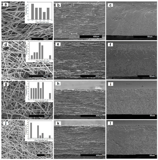 Scanning electron microscopy (SEM) images taken on the surface views and cross-sections of the electrospun poly(3-hydroxybutyrate) (PHB) fibers containing palladium nanoparticles (PdNPs) and their respective annealed films: (a) Surface view of the neat PHB fibers; (b) Cross-section of the neat PHB fibers; (c) Cross-section of the neat PHB film; (d) Surface view of the PHB/PdNP fibers; (e) Cross-section of the PHB/PdNP fibers; (f) Cross-section of the PHB/PdNP film; (g) Surface view of the PHB/PdNP/hexadecyltrimethylammonium bromide (CTAB) fibers; (h) Cross-section of the PHB/PdNP/CTAB fibers; (i) Cross-section of the PHB/PdNP/CTAB film; (j) Surface view of the PHB/PdNP/tetraethyl orthosilicate (TEOS) fibers; (k) Cross-section of the PHB/PdNP/TEOS fibers; (l) Cross-section of the PHB/PdNP/TEOS film.