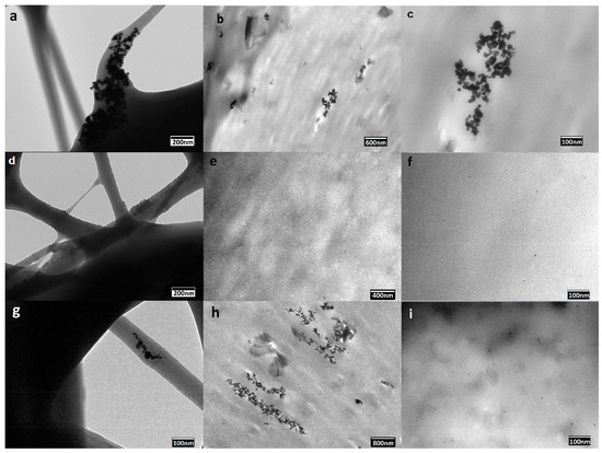 In order to provide a more resolved information about the dispersion of the PdNPs into the PHB biopolymer matrix, TEM was performed on the nanocomposite fibers and films. The distribution of the PdNPs inside the electrospun fibers are illustrated in the TEM images included in Figure 3a,d,g. From the TEM image included in Figure 3a, one can clearly discern that the PdNPs were mainly agglomerated in certain regions of the submicron PHB fibers. One can also observe that the addition of both surfactants, i.e., CTAB and TEOS, as respectively shown in Figure 3d,g, successfully improved the PdNPs dispersion in the PHB fibers. Dispersion and distribution was, however, seen higher in the CTAB-containing sample.