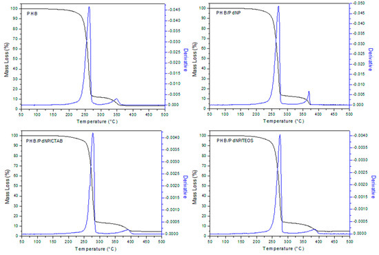 Figure 4 shows the evolution of the mass loss as a function of temperature for the PHB samples, including the curves of the first derivative analysis (blue lines). As shown in Table 2, it can be seen that the neat PHB initiated degradation at 207 °C while the biopolymer fully decomposed in two steps, seen at 262 °C and 348 °C, providing a residual mass of approximately 3%. Thermal degradation of the PHB films containing the PdNPs and the surfactants also occurred in two stages with a slight increase in thermal stability. In particular, the onset degradation took place in the 220–230 °C range that continued to the first degradation stage at 270–275 °C and, at a slower rate, to over 360–380 °C, remaining a residue of 3–4% of the initial mass of the sample. In this sense, Díez-Pascual et al. [29] demonstrated that the incorporation of zinc oxide (ZnO) improved the heat resistance of PHB, which was ascribed to the barrier effect of the nanoparticles that effectively hindered the diffusion of decomposition products during thermal degradation. Therefore, the PdNPs probably also functioned as a thermal barrier, absorbing heat, thus also resulting in an enhanced thermal stability.