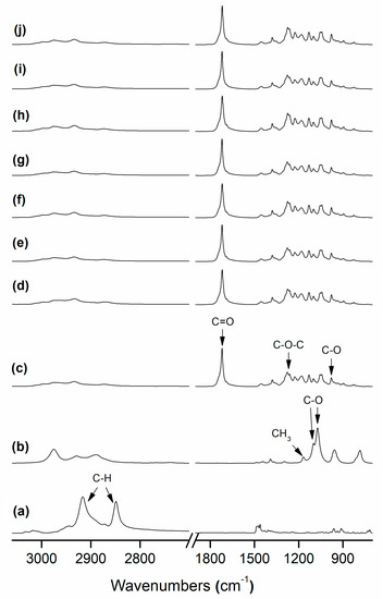 Fourier transform infrared (FTIR) spectra of: (a) Hexadecyltrimethylammonium bromide (CTAB); (b) Tetraethyl orthosilicate (TEOS); (c) Poly(3-hydroxybutyrate) (PHB) fibers; (d) PHB film; (e) PHB/palladium nanoparticles (PdNP) fibers; (f) PHB/PdNP film; (g) PHB/PdNP/CTAB fibers; (h) PHB/PdNP/CTAB film; (i) PHB/PdNP/TEOS fibers; (j) PHB/PdNP/TEOS film. Arrows indicate the chemical bonds and/or groups discussed in the text.