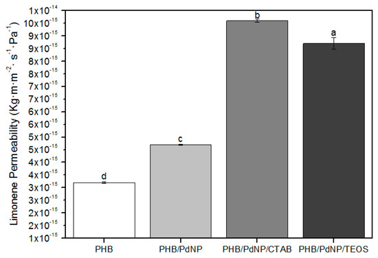 Values of d-limonene permeability (LP) of the electrospun poly(3-hydroxybutyrate) (PHB) and palladium nanoparticles (PdNPs) films with and without hexadecyltrimethylammonium bromide (CTAB) and tetraethyl orthosilicate (TEOS) surfactants. Different letters indicate significant differences among the samples (p < 0.05).