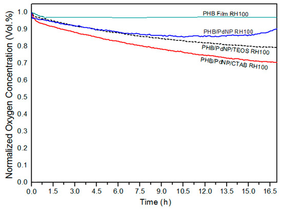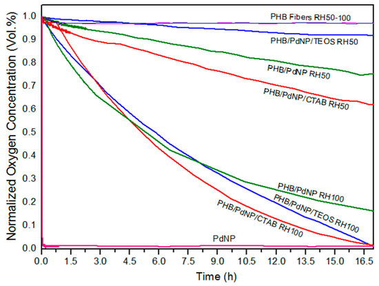 In Figure 9, the oxygen volume depletion obtained with the electrospun films at 100% RH are shown. Comparison between Figure 8 and Figure 9 revealed that the oxygen scavenging effect of the films was considerably lower than that of the same material in the fiber form. This reduction in the OSR is related to the higher surface-to-volume ratio of the electrospun fibers than the films, since the fibers mats present an extremely high porosity. In any case, all PHB/PdNP films still presented significant oxygen scavenging capacity and, among the samples tested, the CTAB-containing films showed the highest performance as expected in view of all the above observations. This result can be explained by the better dispersion of the PdNPs achieved in the PHB matrix using CTAB. In agreement with the data reported here, Ahalawat and co-workers [41] evaluated the simultaneous effects of cationic surfactants on the textural and structural properties of silica nanoparticles. It was observed that the silica nanoparticles displayed better dispersion and lower size than those prepared with other two cationic surfactants using an aqueous TEOS precursor solution with CTAB. In relation to this, it has also been reported that an SiOx matrix between a coating of palladium and the substrate presents higher values of OSR than the palladium coated directly onto PET films [42]. These findings were later confirmed on PLA [10].