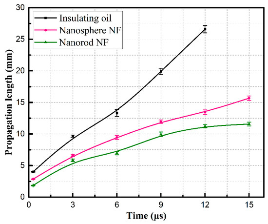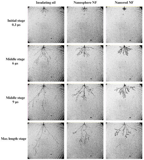 Figure 5 shows the shapes of pre-breakdown streamers from initiation to their maximum lengths (at 12 μs for insulating oil and 15 μs for nanofluids) in insulating oil and two types of nanofluids with nanospheres and nanorods, respectively. The streamers in insulating oil and nanofluids extend to the ground electrode once derived from the needle electrode. In insulating oil, pre-breakdown streamers show a tree-like shape, the same as those reported in References [26,27]. With the increase of propagation time, only two or three filaments are left to develop into main channels, the distance between which is obviously elongated. When compared with the streamer shapes in the insulating oil, streamers in nanofluids show a bush-like shape and have three considerable differences, especially for nanofluid with nanorods. First, more lateral branches are formed in nanofluid with nanorods than the fluid with nanospheres during the propagation process. Second, branches are much denser, and the distance between main channels is much closer in nanofluid with nanorods than that with nanospheres. Third, it is worth noting that streamer propagation length is kept even shorter in nanofluid with nanorods during the propagation process as presented in Figure 6. In addition, the average propagation velocity of streamers in insulating oil is 2.22 km/s according to the slope of curves in Figure 6, which is consistent with propagation velocity of second streamers in mineral insulating oil [6]. Whereas, in nanofluid with nanorods, the velocity is sharply decreased to 0.77 km/s, even lower than that of 1.04 km/s in nanofluid with nanospheres. This observation indicates that the addition of nanoparticles in a rod-like shape has a more significantly inhibiting effect on streamer propagation process than sphere-like ones.