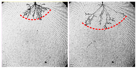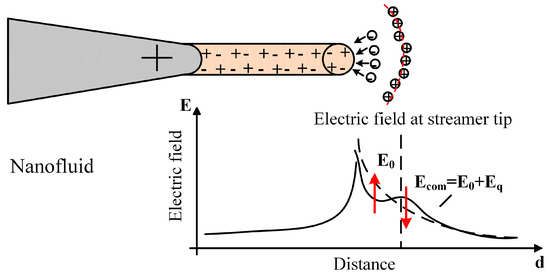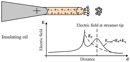 In dielectric liquids, the breakdown strength is related to the streamer propagation, which is strongly affected by the electric field [3,5,6]. The electrons and positive ions are generated at streamer tips by ionization. When compared with positive ions, electrons move out of the ionization region with a much faster speed, leaving positive ions to become the transient space charges, as presented in Figure 7. In insulating oil, positive ions tend to assemble locally due to the filament shape of streamers, resulting in a greater distortion of the electric field. Thus, the electric field towards the ground electrode is enhanced by the space–charge field created by the positive ions, making it easier for streamers to propagate.